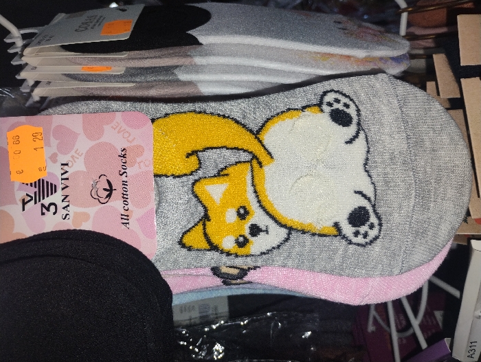 - "A pair of grey ankle socks, adorned with a cartoon depiction of a yellow and white dog, possibly a Shiba Inu or Corgi, facing away and looking over its left shoulder, is the central focus" by FM-YvkWx2, licensed under CC BY 4.0