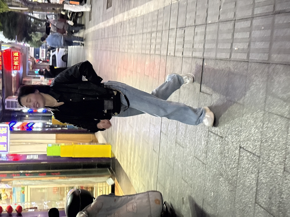 The image depicts an urban street scene in Jiangjin, China, during the evening or night, characterized by artificial illumination from various sources. A female individual, identified as East Asian, is the central subject, walking from the right toward the left side of the frame on a paved sidewalk. She is dressed in a black collared jacket over a dark top, light blue wide-leg jeans, and light-colored casual shoes. A black fanny pack, adorned with a gold-colored chain, is worn around her waist. Her dark, shoulder-length hair is visible. Her eyes are closed, and she displays a distinct smile. Her arms are bent at the elbows, with her hands positioned near her waist. To the left of the main subject, a partial view of a dark-colored scooter or similar vehicle is present. The sidewalk is constructed from rectangular paving stones. Background elements include storefronts featuring glass displays and illuminated signs. A prominent yellow and lime green cylindrical object stands vertically in front of a shop. Further left, a blue and red striped barber pole-style light fixture is visible. In the mid-ground, along the street and sidewalk, multiple individuals are present, including at least three male figures walking or standing. A light-colored sedan is visible on the street. Overhead, a red neon sign with Chinese characters, specifically "兰州拉面" (Lanzhou Lamian), is illuminated. Additional, unidentifiable illuminated signs contribute to the ambient light. A tree trunk is partially visible on the right edge of the frame. The scene is consistent with a commercial district.