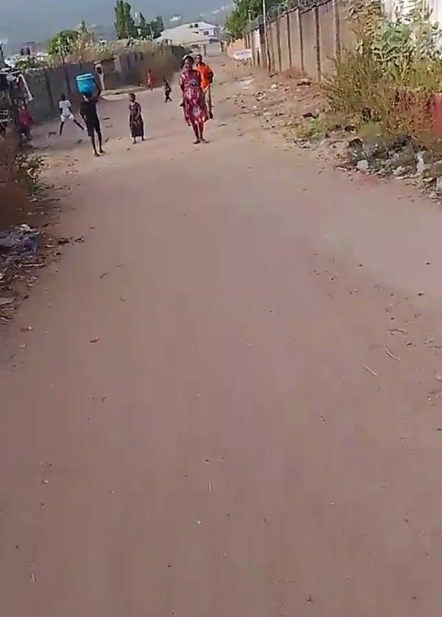 dirt road with people walking down it. A woman in a colorful dress is walking toward the camera. A young girl wearing a dark dress is walking next to her. A person is carrying a blue bucket on their head further up the road. Other people are also walking in the same direction. The road is lined with trash and fences. A hill is visible in the background.