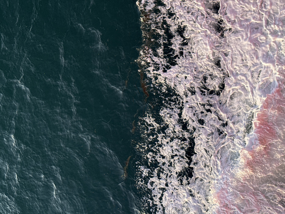 The image displays an overhead view of a body of water. The specific location within the city of Unknown, Greece, cannot be determined from the visual information provided. The upper portion of the frame shows dark teal water with discernible ripples and small waves across its surface. A horizontal band, approximately one-third down from the top, marks a transition zone where the calmer dark water meets a line of white, irregular foam. Within this transition zone and slightly extending into the dark water, several amorphous reddish-brown patches are present. The lower two-thirds of the image are dominated by a highly agitated expanse of white and pinkish-white foam. This foam is dense and turbulent, indicating a significant churning of the water. The pinkish coloration is more pronounced in the lowest section of the frame. No individuals, vessels, or discernible landmasses are visible in the aquatic scene.