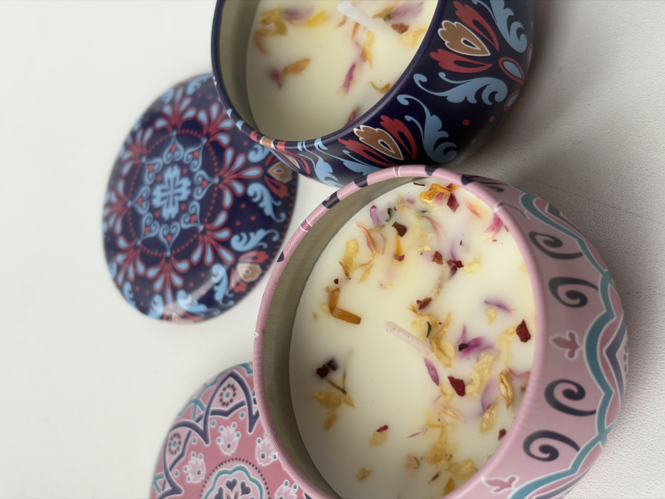 - "In Novosaratovka, Russia, two open decorative metal tins containing candles and two matching lids are positioned on a white surface" by FM-0RQFS2, licensed under CC BY 4.0
