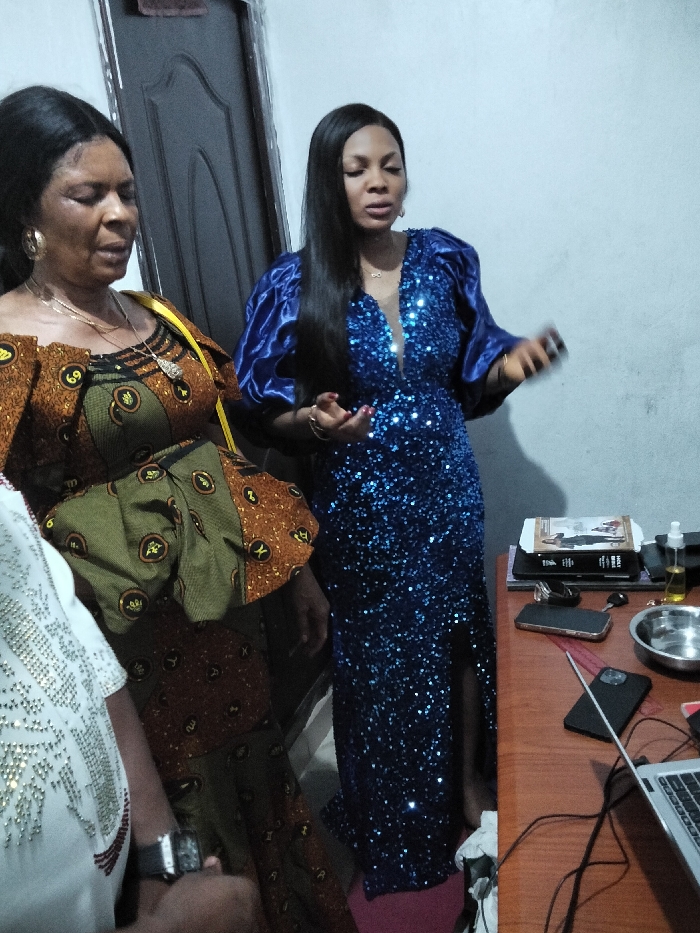The scene is captured indoors in Lekki, Nigeria. Three individuals are present. On the left, an adult female with dark hair wears a traditional African print dress featuring brown, orange, and olive green patterns, along with large gold hoop earrings and a thin gold necklace. A yellow strap is visible over her left shoulder. Her eyes are closed or directed downward, and her mouth is slightly open. To her right, an adult female with long, straight dark hair wears a floor-length royal blue sequined gown with a deep V-neckline containing a sheer insert, and voluminous sleeves. She wears a delicate gold necklace. Her mouth is slightly open, and both hands are partially raised; her right hand appears to hold a dark object, possibly a smartphone. On the far left, partially visible, is the shoulder and arm of a third individual wearing a white garment adorned with metallic embellishments. A dark-strapped watch is visible on their left wrist. The background consists of a plain light-colored wall, with a dark brown paneled door visible on the far left. A brown wooden table is positioned to the right of the center female. On the table, from left to right, are stacked books or boxes, multiple smartphones (at least three), a small clear spray bottle, a small clear bottle containing a yellowish liquid, a silver metallic bowl, a red ruler, and a silver laptop computer connected by wires. A section of pink or reddish fabric is visible on the floor beneath the center female. The lighting in the room is moderate.