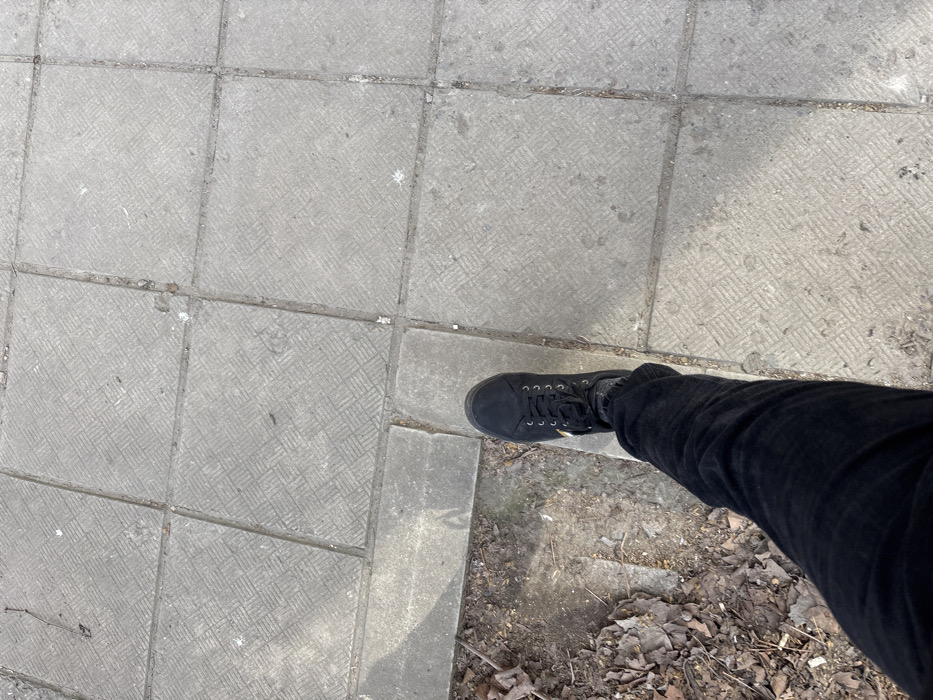 - "An overhead view captures the lower portion of a person's left leg and foot situated on a sidewalk in Targovishte, Bulgaria" by FM-cBlX62, licensed under CC BY 4.0