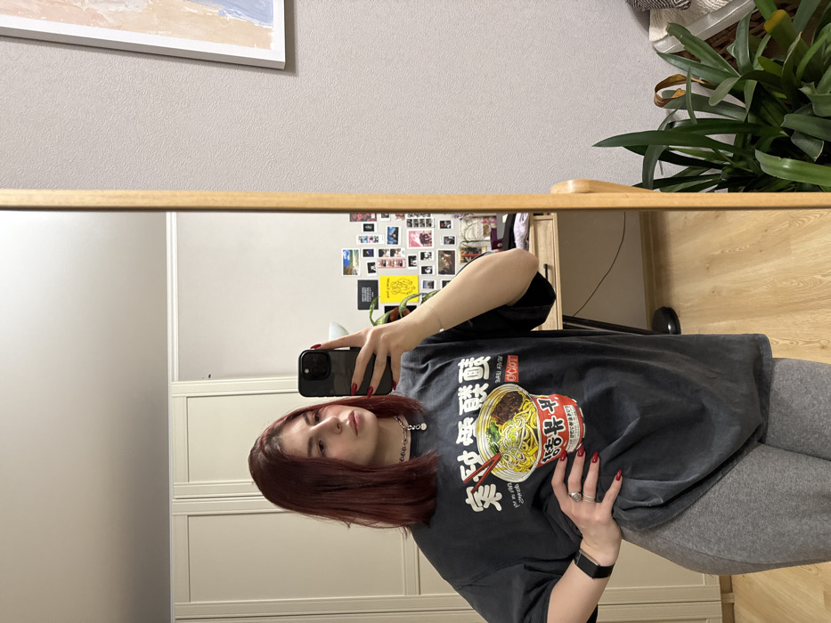 A female individual, appearing to be in her 20s, with shoulder-length reddish-brown hair, is depicted taking a mirror selfie in an indoor residential setting in Dolgoprudny, Russia. She stands angled towards her left, with her left hand placed on her hip, and is looking towards her right, away from the camera. She holds a dark-colored smartphone in her right hand, reflecting her image in a large, vertically oriented mirror with a light wooden frame. The subject is wearing a dark grey, oversized t-shirt featuring a graphic of a cup of ramen noodles with Japanese characters, and grey fitted pants or leggings. She has red nail polish, a silver-colored necklace with a pendant, and a dark smartwatch on her left wrist. The environment visible in the mirror's reflection includes a light-colored two-door wardrobe on the left, a wooden desk with a white lamp and a collage of small photographs or prints taped to the wall above it on the right. The room features light wood flooring. To the right of the mirror, directly visible, is a textured light grey wall displaying a framed piece of abstract art with blue, beige, and white tones. A large green potted plant with broad leaves rests on the floor in the lower right corner, next to a light-colored, textured throw or blanket partially visible on an unseen furniture piece.