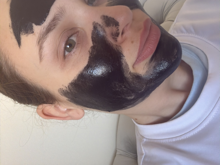 A fair-skinned person's face is partially covered with a dark, shiny substance, likely a face mask