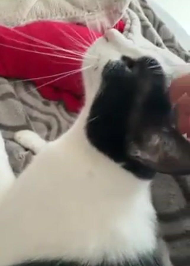 A close-up video shows a white cat with black patches lying on a gray patterned blanket. A hand reaches into the frame and gently scratches behind the cat’s ears. A red cushion and a white cable-knit blanket are visible in the background.