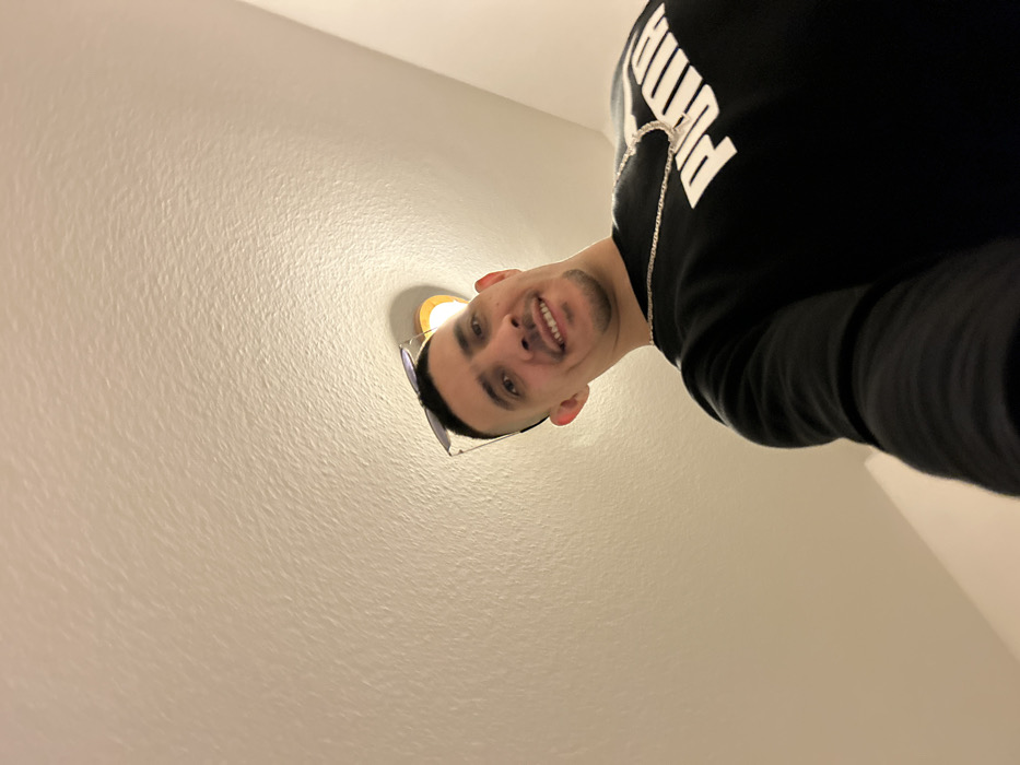 A person wearing a black Puma sweatshirt and a silver chain is looking down at the camera. They are smiling and wearing sunglasses on their head. A light fixture is visible behind their head. The background consists of a beige wall. The image is rotated so that the person appears to be standing on the wall.