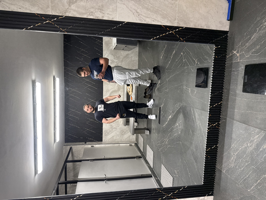The scene depicts two adult males reflected in a large, dark-framed mirror within a modern changing room or restroom facility, located in Ashbourne, Ireland. The man on the left (in reflection) is an adult male with short dark hair and a beard, wearing a black short-sleeved t-shirt with a white graphic, black athletic pants, and white athletic shoes. He stands facing the mirror with arms slightly flexed, fists clenched, and is looking directly forward. The man on the right (in reflection) is an adult male with short dark hair, wearing a dark blue short-sleeved t-shirt with a white logo, light grey athletic pants, and black athletic shoes. He holds a dark-colored smartphone in his left hand, looking down at it. The room features dark grey tiled flooring with lighter grey veining. To the left in the reflection are two light grey, floor-to-ceiling doors with dark frames, indicative of changing cubicles or restroom stalls. A metal bench is positioned centrally in the background. On the floor near the bench, a pair of dark shoes are visible, and a light-colored item rests on the bench. Two rectangular, ribbed, light-colored floor mats are placed on the tiled floor near the cubicles. The back wall behind the men is covered with dark, vertically grooved paneling featuring diagonal lighter streaks. A grey vanity unit with a sink is partially visible to the far right in the reflection. Two rectangular fluorescent light fixtures are mounted on the light grey ceiling. A black digital floor scale is present on the floor in the foreground, with its reflection visible within the mirror near the men's feet.