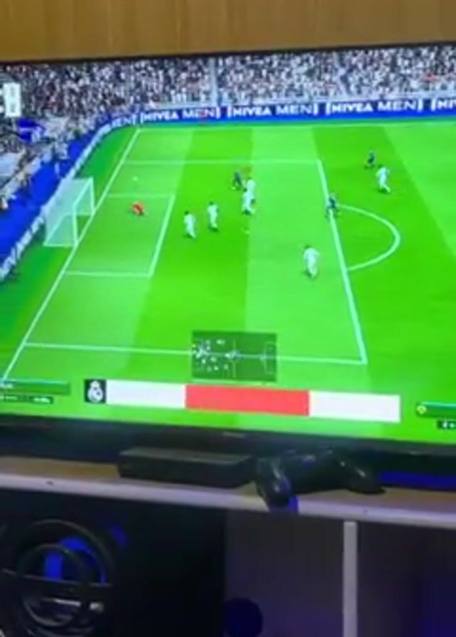 television screen displaying a soccer game being played on FIFA