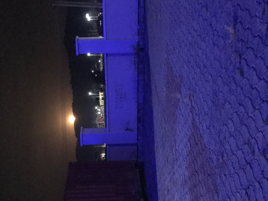 This nighttime image, captured in Bwari, Nigeria, depicts an outdoor scene with artificial and natural light sources. In the foreground, a paved surface of interlocking bricks extends from the viewer, appearing predominantly blue due to strong artificial illumination. Scattered sparse vegetation is visible between the bricks. A light-colored concrete perimeter wall, approximately 1.5 meters in height, runs horizontally across the midground. This wall features two prominent rectangular pillars, one on the left and one on the right, both illuminated by a distinct blue light that casts shadows and hues onto the foreground. Faint, dark lettering, possibly reading "CAR PARKED AT OWNERS RISK," is discernable on the wall between the pillars. To the far left, a large, dark red, vertically oriented rectangular structure, possibly a shipping container, is partially visible. Beyond the wall in the background, numerous bright white streetlights illuminate a distant area, with some red lights also present. Above these lights, a dark, undulating mountain range or set of hills is visible, silhouetted against the dark sky. A large, bright orange-yellow celestial body, consistent with a moon, is positioned low above the distant mountains. A faint horizontal line, likely a power line, traverses the sky above the mountain range. No human figures are present.