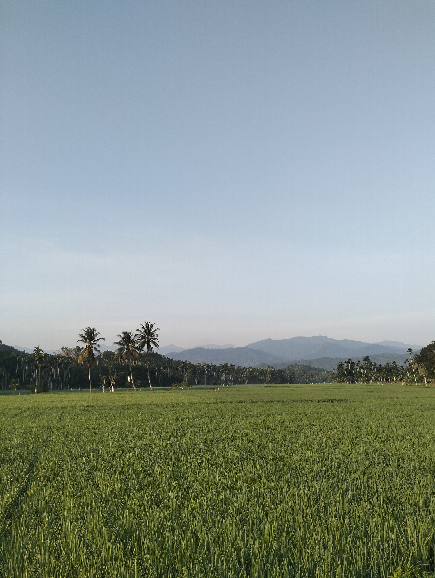 This landscape image depicts a vast, verdant green rice paddy field located in Meunasahalue, Indonesia. The foreground and mid-ground are entirely covered by uniformly green rice plants, indicating an active cultivation area. In the middle distance, a line of tall palm trees, including several prominent coconut palms with dark green fronds, separates the cultivated land from the background. Behind these, a dense stand of slender, columnar trees, consistent with betel nut palms, forms a tree line. Faint, vertical white elements, possibly flags or markers, are discernible within this tree line. The background features a range of hazy, blue-tinged mountains with undulating peaks stretching across the horizon. Above the mountains, a clear, pale blue sky occupies the upper portion of the frame. No human figures or animals are visible in the scene. The lighting suggests ambient daylight conditions.