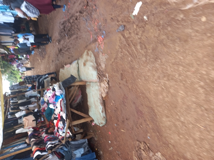 street market in Soweto, Tanzania, located at coordinates -3.348 latitude and 37.321 longitude. The scene is a busy marketplace with a variety of goods being sold. There are multiple stalls with clothes for sale, including clothing, footwear, and other various items. A woman is lying down on a table, likely resting or tending to her merchandise. There are several individuals walking through the market, with one man standing by a stall with a backpack. The ground is dirt and mud, with tire tracks from vehicles. The environment is cluttered and disorganized. The lighting is bright and sunny. The image appears to have been captured during the daytime, with a medium shot perspective.