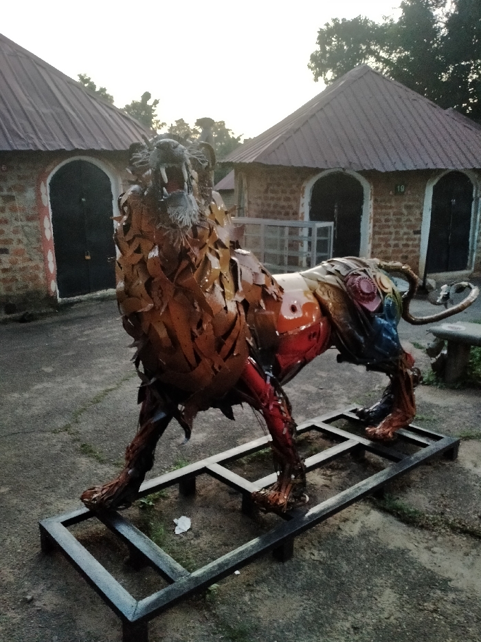 An outdoor scene in the city of Unknown, Unknown, features a large, multicolored scrap metal sculpture of a roaring lion. The sculpture, positioned in the foreground, stands on a black rectangular metal frame. Its mane and forequarters are predominantly brown and orange, composed of overlapping metal plates, with the mouth open revealing teeth. The mid-body and hindquarters incorporate reds, blues, and other colors from various metal components. In the background, two circular, brick-built structures with conical, reddish-brown corrugated metal roofs are visible. Each structure has a dark, arched doorway; the rightmost structure displays the number "19" above its entrance and a light-colored fence-like barrier in front. Dark green trees rise above the buildings under a bright, overcast sky. The ground consists of a grey paved surface, with some scattered debris and sparse vegetation. No people or specific actions are depicted.