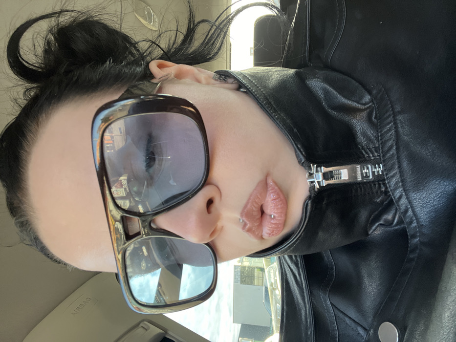 An individual, identified as an adult female, is depicted in a close-up view from within a vehicle in Gnojnice, Bosnia and Herzegovina. The subject has dark hair styled in an upward bun and wears large, dark brown, square-framed sunglasses with blue-tinted lenses. A silver philtrum piercing is visible above glossy, light-colored lips, which are slightly puckered. The individual is dressed in a black, high-collared jacket featuring a prominent silver front zipper and a silver snap button on the left lapel area. A dark earring is present on the subject's right ear. Reflections in the sunglasses display an exterior environment, including a cloudy sky, building structures, and other vehicles. The reflection in the left lens (viewer's right) shows a sign with red text and numbers, possibly "8.88," consistent with a commercial establishment. The vehicle's light-colored headliner, bearing the text "AIRBAG," is visible in the upper left portion of the frame.