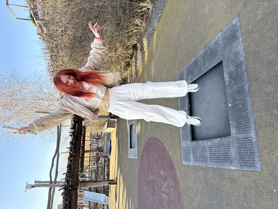 - "A young adult female with bright red hair is captured mid-jump on a rectangular in-ground trampoline at a playground in Shakhty, Russia" by FM-RJWfF2, licensed under CC BY 4.0