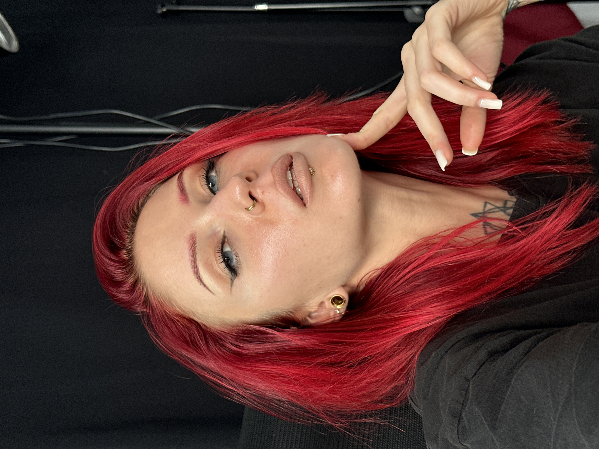 A portrait image depicts an adult female positioned from the mid-chest upward. She has long, vibrant red hair and fair skin. Her eyes are blue, accentuated by black winged eyeliner, and her eyebrows are styled and red-toned. Facial piercings include a double gold ring in her left nostril and a gold stud in her labret below the lower lip. Her left earlobe features a gold flesh tunnel and an adjacent small gold stud earring. Her lips are covered with a nude or light brown substance. A dark, possibly geometric tattoo is partially visible on her lower neck/upper chest area. She wears a black short-sleeved top. Her left hand, featuring white-polished fingernails, has its index finger lightly touching her chin. The background is primarily dark, showing faint vertical structures and a partial reflective surface on the right, indicative of studio equipment. A dark, possibly black, chair back is visible behind her left shoulder. The scene is located in Kerobokan, Indonesia.