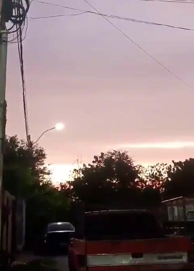 street scene at sunset with a red pickup truck parked on the right side of the road. A person stands near the truck, and a small black dog is on the left side of the street, near a utility pole laden with wires. In the background, there are trees, other vehicles, and a house with a light on. The sky displays pink and purple hues from the setting sun. The camera angle shifts slightly, moving up and down and panning across the scene.