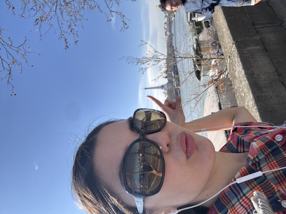 The scene is an outdoor daytime view of the Seine River in Paris, France, under a clear blue sky. In the immediate foreground, a female subject is positioned to the left, capturing a selfie. She wears large, black-framed sunglasses, reflecting a street scene with buildings and a person holding a device, and white wired earbuds with a visible in-line control. Her lips are pursed, and her right index finger is extended, pointing towards the background. She is dressed in a red, green, and blue plaid shirt. Beyond a concrete wall, the Seine River occupies the midground, featuring multiple bridges and several moored vessels along the opposite bank. Sparse, leafless trees are visible on the riverbanks. The Eiffel Tower stands prominently in the distant background, centered in the frame. To the far right, partially visible behind the concrete wall, a male subject with dark hair, glasses, and a mustache wears a blue garment and shorts, facing left.