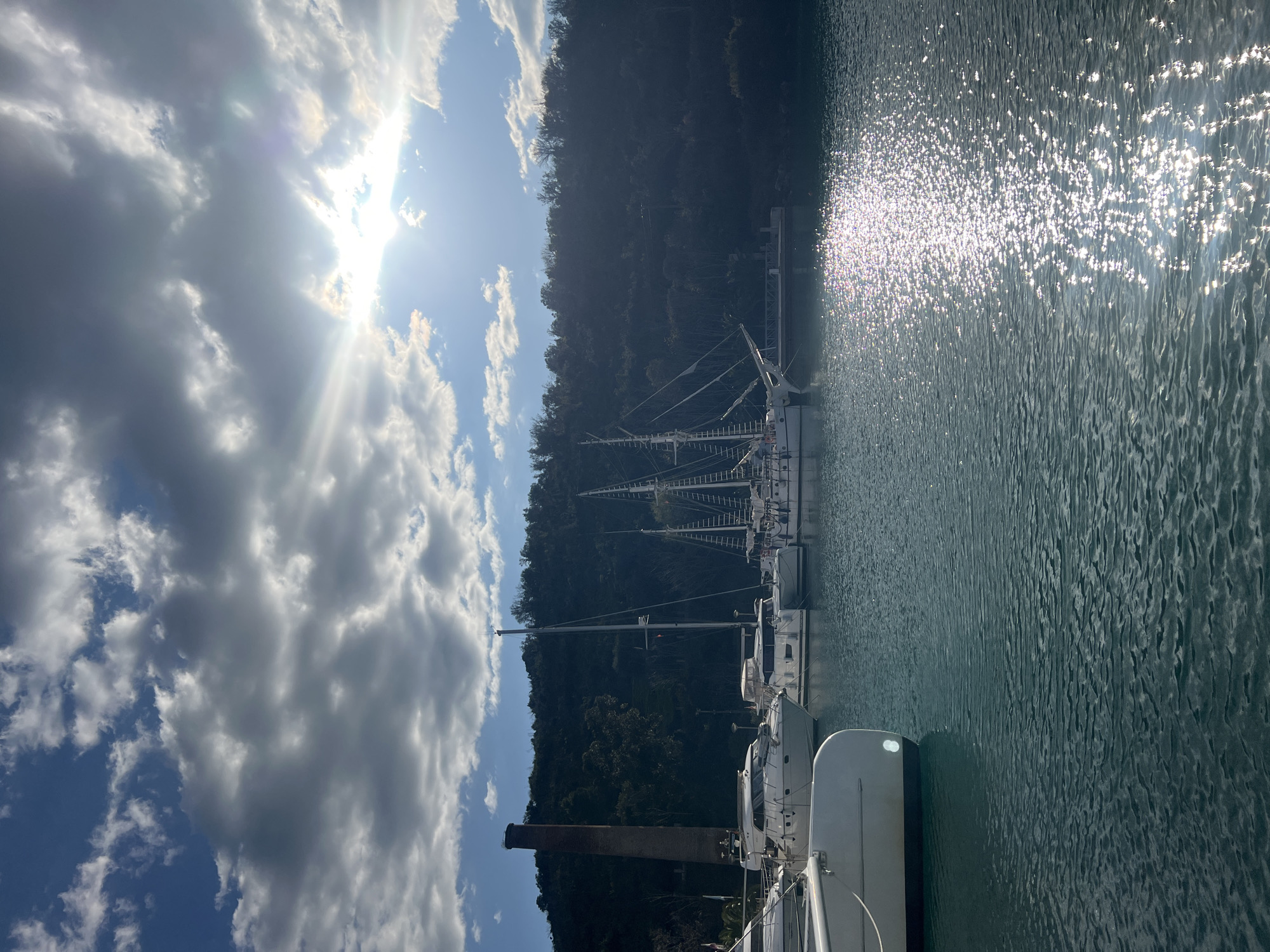 The scene depicts a marina or bay area in Đuraševići, Montenegro, under a partly cloudy sky with bright sunlight. The sun, positioned in the upper right, casts a strong path of sparkling reflections across the calm, dark teal water. In the foreground on the left, the white bow of a catamaran is partially visible. Moored in the midground, from left to right, are a white motor yacht, a white catamaran, and a large white multi-masted sailboat with extensive rigging and ladders. These vessels are docked against a backdrop of a densely forested hillside, which appears dark due to backlighting. A tall, slender brick industrial chimney is visible on the left side of the forested hill. A small wooden pier extends from the shore further to the right, beyond the moored vessels. No individuals are visible in the scene.