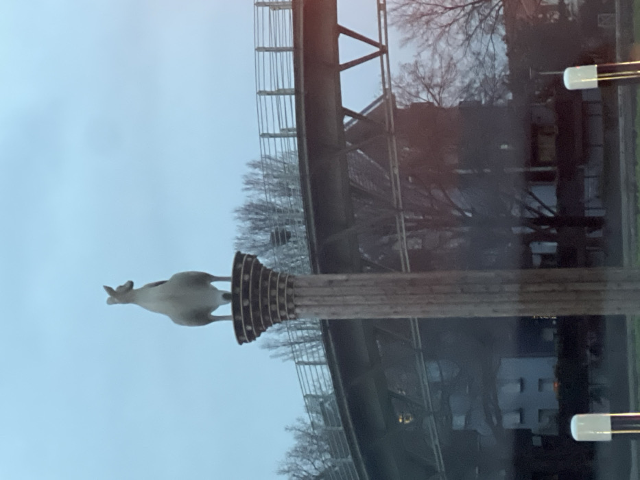 A kangaroo statue tops a tall, cylindrical column with ringed details. The column appears to be made of a wood-like material. In the background, a metal structure resembling a bridge or scaffolding is partially visible, along with bare trees and a building with windows. The sky is overcast. Part of a window frame or door is seen on the side.