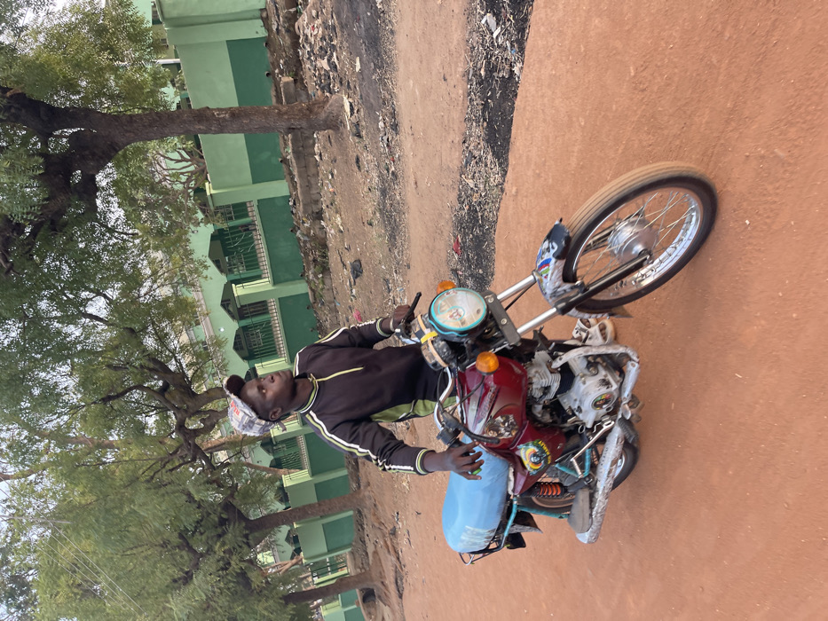 The image depicts a male individual standing alongside a motorcycle on a reddish-brown dirt path in Muchiya, Nigeria