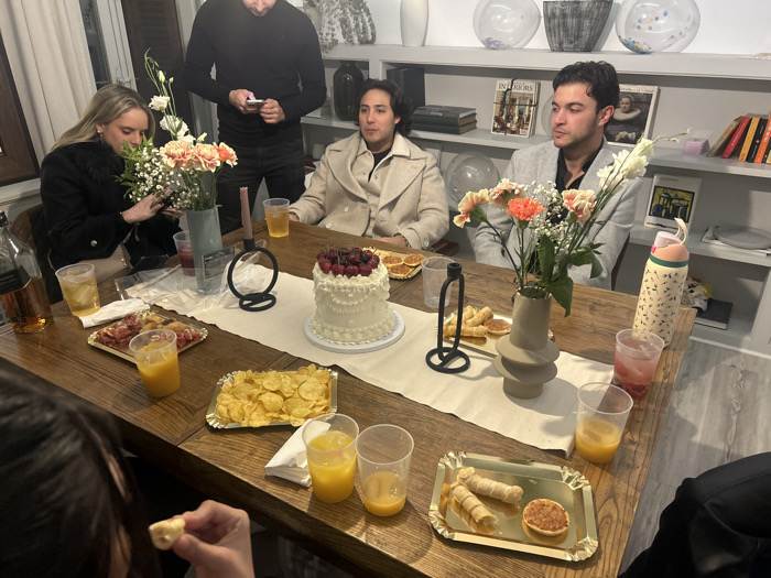 A group gathers around a wooden table laden with refreshments. A cake adorned with cherries anchors the table's center, flanked by platters of chips, meats, and pastries. Drinks in clear cups and vases filled with flowers add color. People are dressed in semi-formal attire, with some standing and others seated around the table. A bookshelf lines the wall behind them.