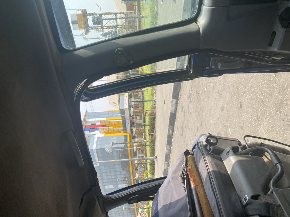 The scene depicts an exterior urban environment in Gwarinpa, Nigeria, observed from within a vehicle. The vehicle's dark interior roof lining and a rear seat, partially folded with exposed light-brown foam and dark material covering, occupy the foreground on the left. The right side of the image shows the open frame of a vehicle door and its interior plastic trim. Outside, an asphalt road adjoins a concrete curb, beyond which lies a grassy median enclosed by a low metal fence featuring decorative concrete pillars. Several decorative streetlights with spiraling posts are aligned along the grassy area in front of a prominent multi-story building. This building, located in the mid-ground, features blue-tinted glass paneling and a striking facade incorporating yellow, red, and blue geometric elements. To the right of the primary building, a tall, dark-colored metal water tower with a rectangular blue and red tank assembly atop, equipped with visible solar panels, stands against a clear, bright sky. Two small, light-colored wooden stools rest on the grass near the fence. No individuals or specific actions are discernible.