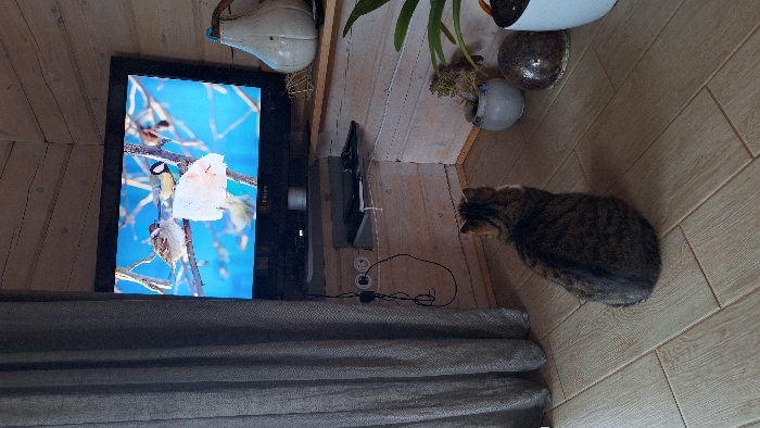 - "A gray tabby cat stands on a light wood floor, looking intently at a television screen displaying an image of birds on branches against a blue sky" by FM-rvqAv1, licensed under CC BY 4.0