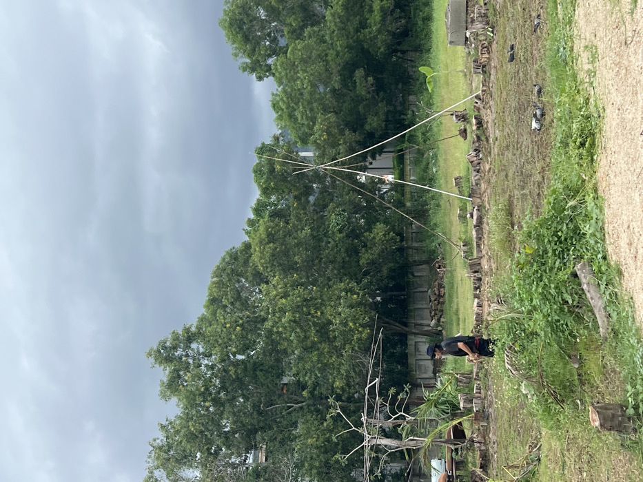 A yard with cut trees and stumps under a cloudy sky. A person in dark clothing stands amidst the greenery. A triangle-shaped frame of wooden poles stands tall. There's a mix of vegetation and a dirt path on the right side of the yard.
