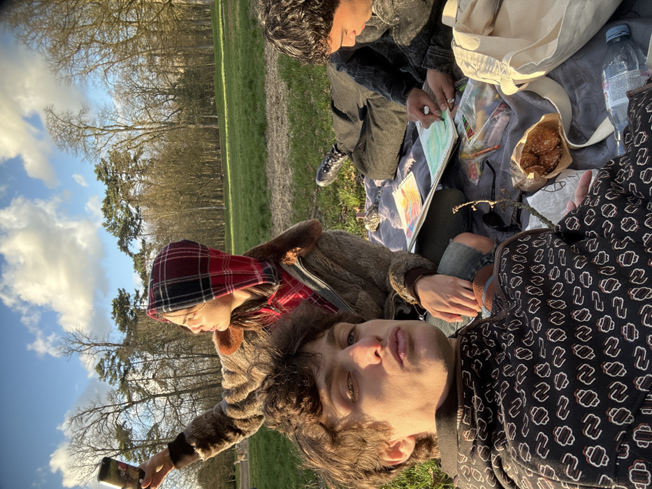 - "Three young adults are gathered on a grey blanket laid on a grassy field in what appears to be a park environment in Saint-Mandé, France, under a blue sky with scattered clouds, illuminated by late afternoon sunlight" by FM-y5OoI2, licensed under CC BY 4.0