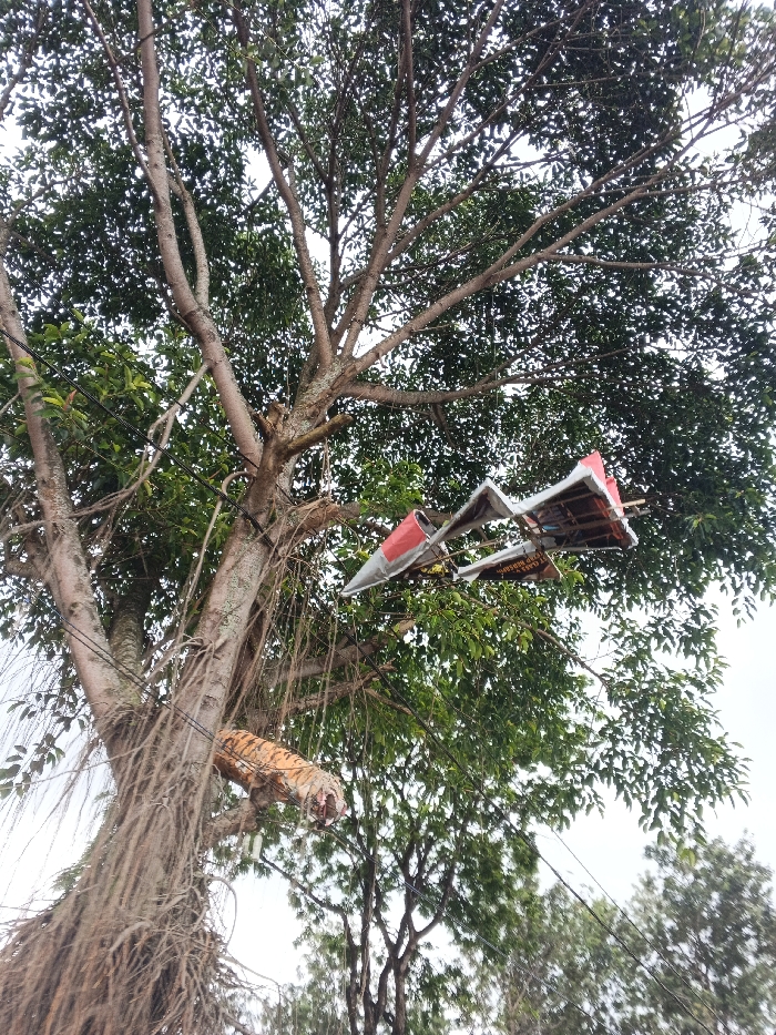 The scene depicts a large tree in Kalipayan, Philippines, viewed from a low angle against an overcast sky. The tree features a thick trunk with numerous hanging aerial roots and dense green foliage. Suspended within the upper right canopy is a model of a jet aircraft, primarily silver with red wing and tail accents, oriented as if in a downward trajectory. A stuffed tiger ornament, orange with black stripes, hangs from a lower branch to the left of the aircraft model, its head pointed towards the ground. Multiple black utility wires traverse the mid-left area, passing through the tree's branches and roots. No individuals are present.