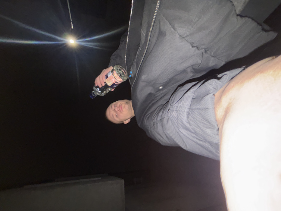 A low-angle, nighttime photograph captures an adult male figure from the waist up, centered against a dark sky. The individual, appearing to have a shaved head or very short hair and a short beard, wears a dark, possibly black or dark grey, zippered jacket. His right hand holds a clear glass bottle containing a translucent liquid, approximately half full, with a label visible. He looks directly into the camera with a neutral expression. A bright, artificial light source, possibly a streetlamp, is visible in the upper right of the frame, emitting a starburst effect. A dark, indistinct architectural structure or overhang is partially visible along the left edge. The bottom left quadrant of the image shows a portion of a light-skinned hand or forearm, indicating the low-angle perspective is likely from the subject holding the camera. The environment is outdoors and poorly lit, characteristic of an urban night scene. No specific landmarks are discernible to pinpoint a precise location within Sofia, Bulgaria.