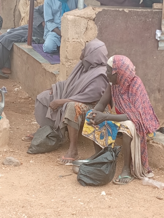 Two older women sit side-by-side on a weathered concrete ledge, possibly outdoors. The woman on the left wears a long, gray headscarf and patterned skirt. The woman to her right has a red and pink patterned head covering, a yellow and blue skirt, and holds her hands together. Two black plastic bags are placed on the ground near their feet. Other people, some in traditional attire, are visible in the background, sitting on a higher ledge. The ground is dusty, giving the scene a simple and possibly rural ambiance.