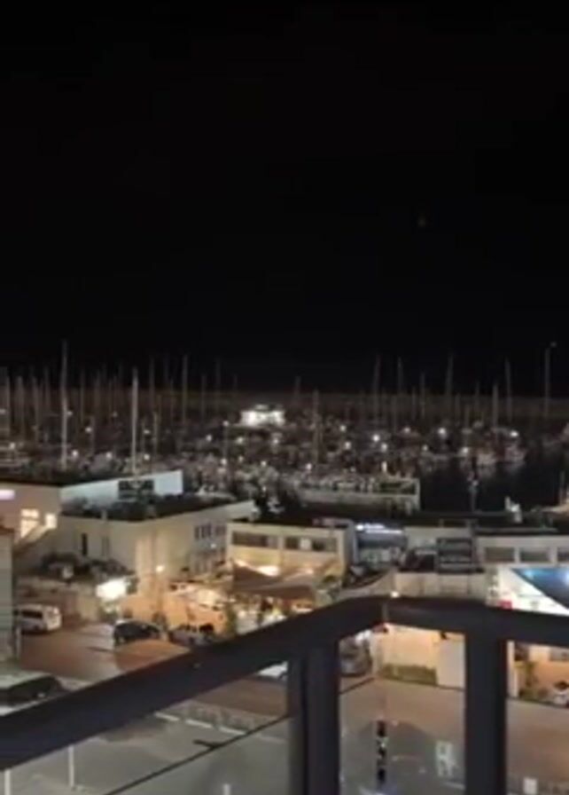 The video presents an elevated, nighttime view of a marina filled with numerous sailboats, each with its mast clearly visible. Below the marina, a row of low-rise, brightly lit buildings lines the waterfront. A parking lot in front of these buildings contains several parked vehicles. The shot is taken from a balcony, as indicated by the visible railing in the foreground. Three green orbs of light are seen in the upper part of the sky. The overall scene is calm and stationary.