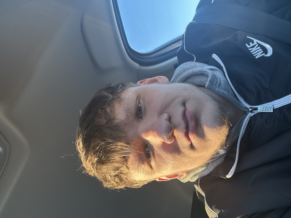 The image features a male individual, appearing to be a young adult, positioned inside a vehicle, understood to be located in Bolshoye Savino, Russia. He has short, light brown hair styled over his forehead, blue eyes, and light stubble on his chin, forming a goatee. He is wearing a black zippered jacket featuring a white Nike swoosh logo on the right chest, layered over a grey hooded sweatshirt. A black seatbelt is visible across his right shoulder and chest. Strong direct sunlight illuminates the right side of his face and hair, creating shadows on the left. Above the individual, the vehicle's light grey headliner is visible. Through the car window on the right side of the frame, a clear blue sky is apparent, indicating an outdoor, daytime setting. The individual is looking directly towards the camera with a neutral expression.