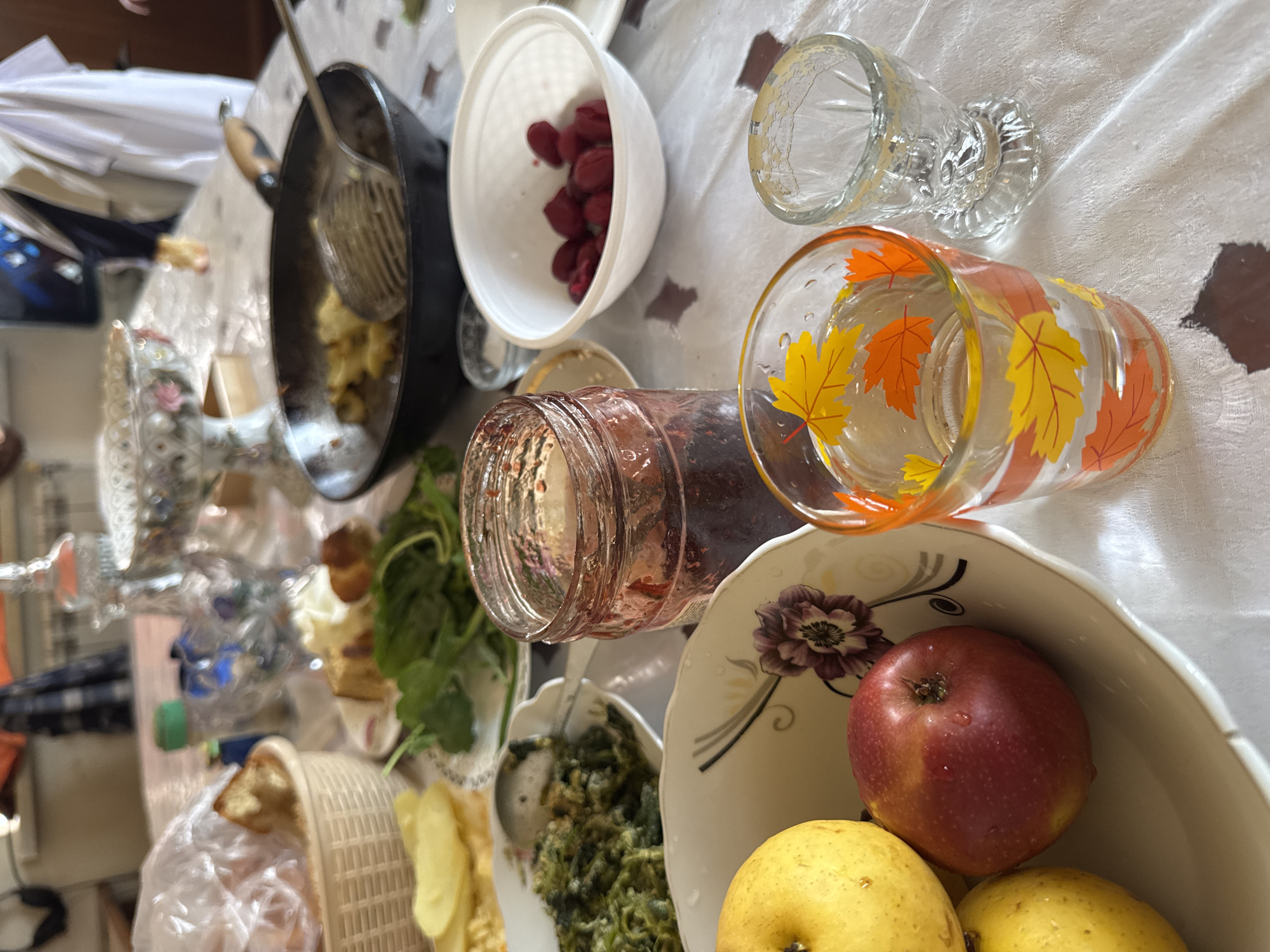 This image depicts a dining table laden with food and beverages, located in Nor Artamet, Armenia. The table is covered with a white tablecloth, possibly textured. In the foreground, to the left, a light-colored, scallop-edged bowl with a floral design holds two yellow fruits, resembling apples or pears, and one red apple, all showing water droplets. Adjacent to it, a clear glass jar contains a dark red preserve. To the right of the jar, a clear drinking glass adorned with orange and yellow autumn leaf motifs holds a transparent liquid. Next to this glass, a smaller, clear, footed cut-glass vessel is present. Moving towards the mid-ground, a white oval dish on the left contains a green, cooked leafy dish, possibly spinach, with a spoon resting in it. To the right of the jam jar, a white plastic bowl holds several dark red, oval-shaped items, resembling cherries or berries. A black frying pan, positioned centrally in the mid-ground, contains irregularly shaped cooked yellow food items, possibly potatoes, with a metal slotted spoon resting inside. In the background, out of focus, a light brown woven basket containing bread wrapped in clear plastic is visible on the far left. A decorative, possibly ceramic, bowl on a pedestal is visible towards the center-right. Several small bottles or containers are scattered across the table. Partial figures of individuals are dimly visible in the blurry background, one appearing to wear a white garment. The indoor environment suggests a room with a radiator on the far left wall and a doorway opening on the right.