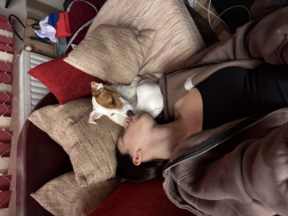 An indoor scene depicts a female individual and a white and tan Jack Russell-type dog occupying a burgundy leather sofa laden with textured beige and red cushions. The female, positioned on her left side, wears a brown zippered hoodie over a black tank top. Her dark hair is pulled back. She has her lips pursed, directed towards the dog's face. The dog rests its head near her mouth, indicating close interaction. In the background, a white radiator is visible beneath red vertical blinds. To the right of the sofa, a light brown handbag and other personal effects are casually placed. The setting is a private residence in Galabovtsi, Bulgaria.