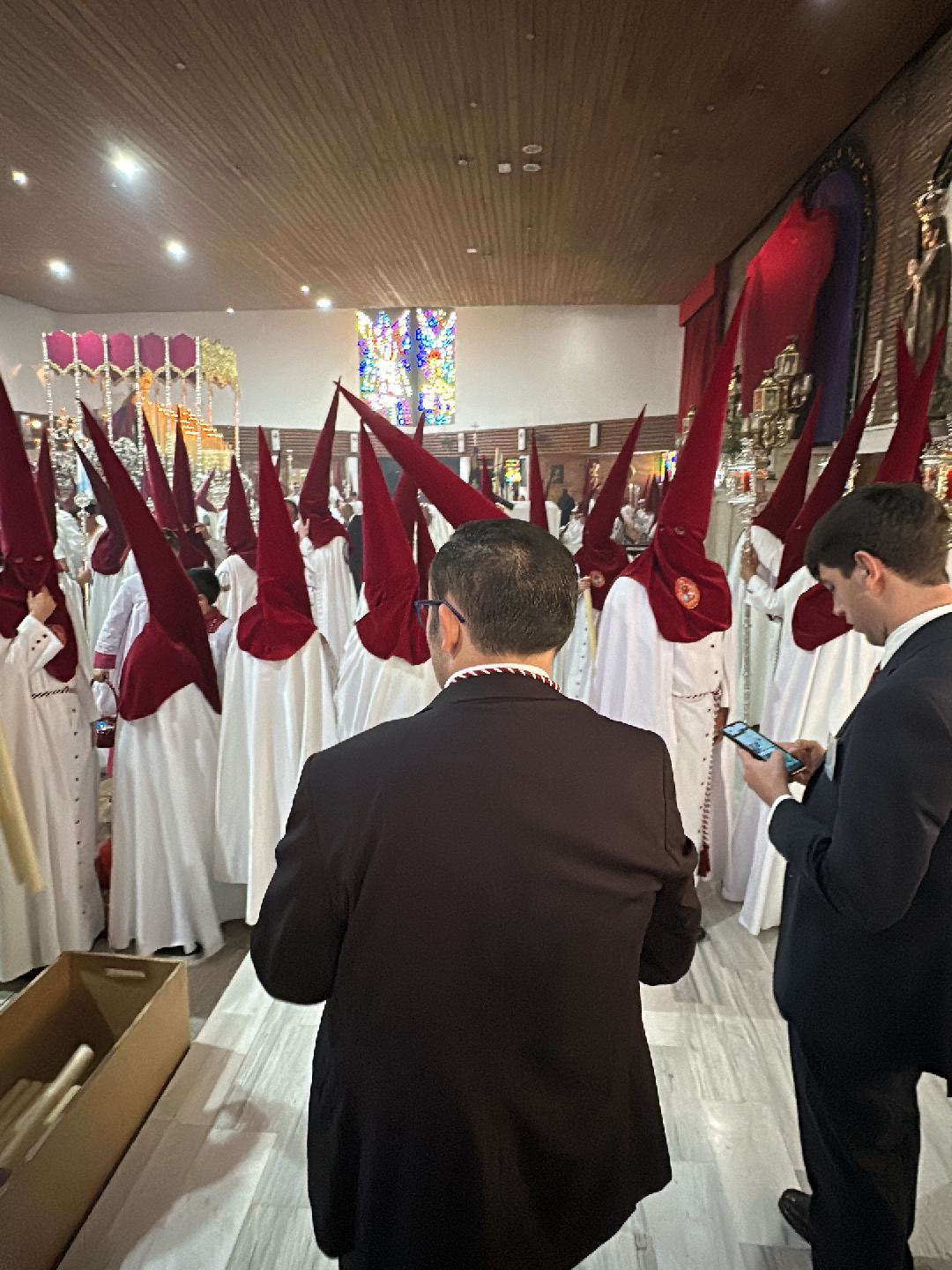 group of people dressed in white robes and tall, pointed red hoods standing inside what appears to be a church or religious building. In the foreground, two men in dark suits stand facing the group; one man is holding and looking at his cell phone. A cardboard box filled with rolled-up white items, likely candles, is visible on the left. In the background, a stained glass window and a decorated platform or altar can be seen. The location is the city of Jerez de la Frontera, Spain.