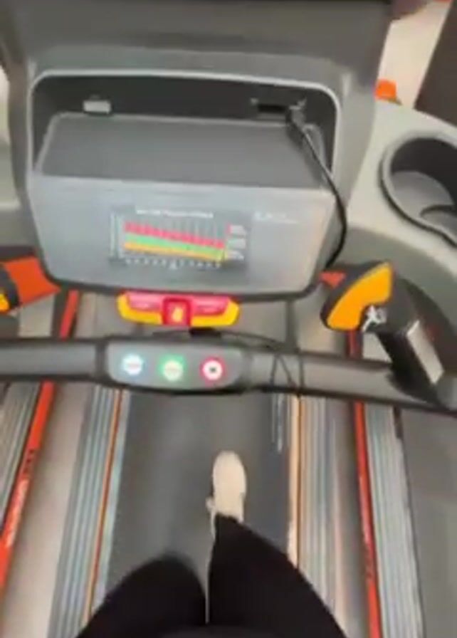 person walking on a Matrix treadmill. The camera is positioned looking down at the treadmill belt, and the person's feet and legs are visible in the foreground. The treadmill's console is in view, showing the machine's controls and display panel, with a progress bar lit up in green, yellow, and red. The gym environment with other exercise machines like elliptical trainers, with their orange accents, is visible in the background. The lighting in the gym appears to be bright.