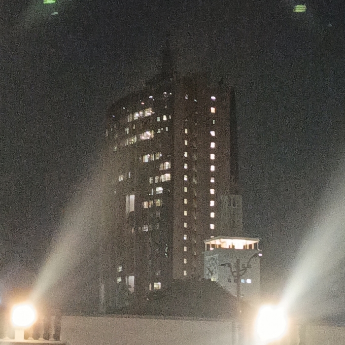 The image displays a nighttime urban scene in Nairobi, Kenya, centered on two prominent architectural structures. The primary subject is a multi-story, high-rise building, identified as the Nairobi General Post Office (G.P.O.) building, occupying the left and central portion of the frame. This structure exhibits a dark-toned facade with numerous illuminated rectangular windows across multiple floors. To the right and slightly in front of the G.P.O. building is the Nairobi Clock Tower, a distinct, lighter-colored, multi-tiered structure. Its uppermost section is brightly illuminated from within, featuring an open or observation-like architectural design. Patterns or symbols are discernible on the tower's side. The sky is dark, consistent with night. In the immediate foreground, two out-of-focus, intensely bright artificial light sources are visible, casting upward beams. A dark, indistinct barrier or railing runs along the bottom edge of the frame. No individuals, vehicles, or specific actions are discernible within the image.