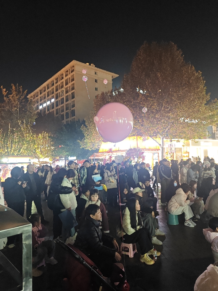 This nighttime image captures a dense gathering of people in an urban public space within the Chongqing High-tech Zone, China. In the foreground and mid-ground, a large crowd comprises numerous adults and children, many standing and observing an unseen focal point to the left of the frame. Several individuals are seated on small, brightly colored plastic stools (pink, green) on the dark paved ground. One person in a dark puffer jacket is seated, seemingly operating a dark-colored stroller. A prominent, large spherical pink balloon, reflecting ambient light, floats centrally in the mid-ground, with a smaller pink spherical attachment to its left. In the background, a multi-story building with numerous windows, some illuminated, is visible on the left under a dark night sky. To its right, a large deciduous tree with sparse leaves stands, illuminated by warm artificial light. Smaller trees adorned with decorative string lights are also present on the left. Several smaller, spherical pink lights or balloons are suspended in the air, with one visible near the building and another near the large tree. Illuminated storefronts or stalls, some featuring red and yellow lighting, are visible behind the crowd in the mid-ground, suggesting a commercial or event area. The overall scene is brightly lit by a combination of artificial sources, creating a vibrant atmosphere.