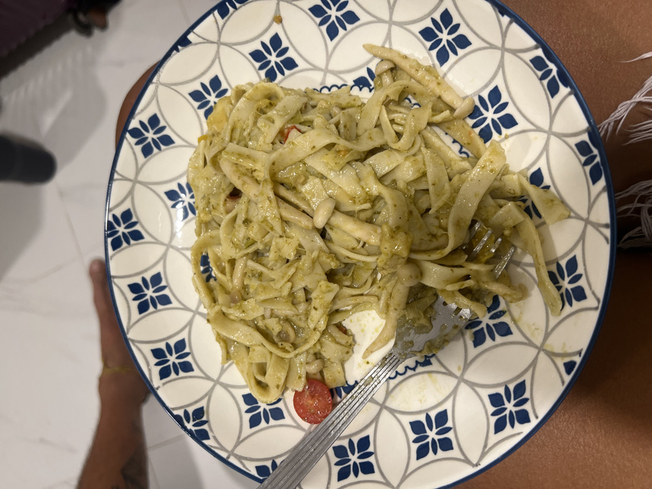 A plate of tagliatelle pasta with pesto sauce is presented, speckled with small tomato pieces. A silver fork rests on the plate, partially obscured by the pasta. The plate features a white base with a blue and white geometric pattern resembling stylized flowers. The plate is positioned on a white tiled floor, with portions of a person's leg and foot visible at the edges of the frame.