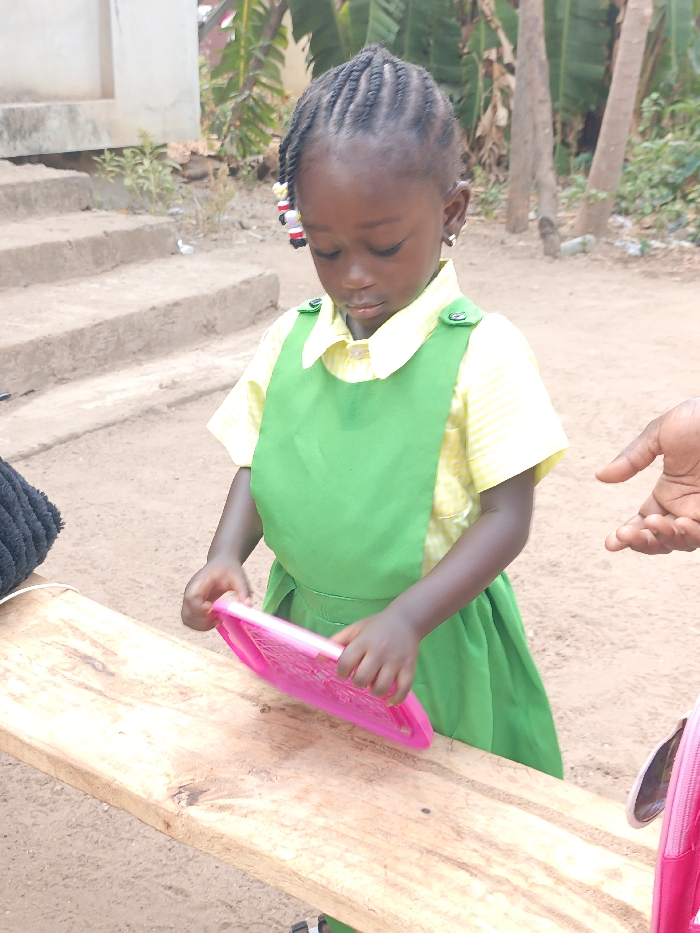 A young Black girl is depicted outdoors, positioned in front of a light brown wooden surface, possibly a bench or table, in the city of Unknown, Unknown. She wears a yellow and white checkered short-sleeved shirt under a solid green pinafore dress with shoulder strap buttons. Her dark hair is styled in braids, with red, white, and black beads adorning some braids near her left temple. Small hoop earrings are visible in her ears. Her gaze is directed downwards at a bright pink, rectangular object, possibly a tablet or drawing board, which she holds with both hands on the wooden surface. To the left of the girl on the wooden surface, a black, textured object is partially visible. To the far right, a partial view of an adult's dark-skinned right hand is present, open-palmed, and a pink bag or case is also visible. The ground consists of light brown dirt or sand. In the background, concrete or stone steps ascend towards a lighter-colored building foundation, surrounded by sparse vegetation and various tree trunks, indicative of a tropical or semi-tropical outdoor setting. The scene is illuminated by natural daylight.