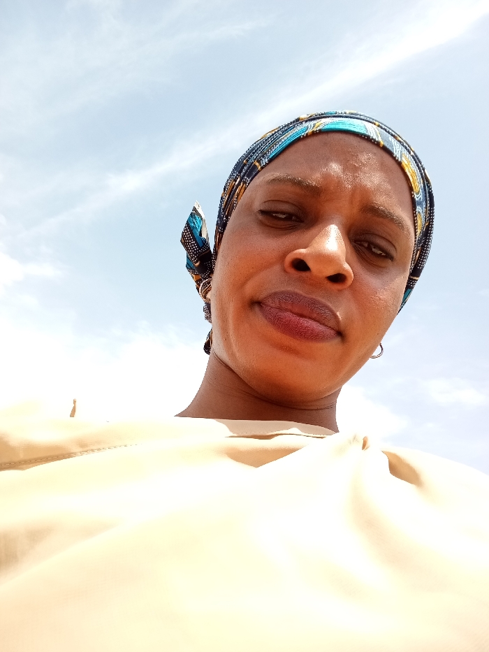 This low-angle, close-up image, taken in Kakau, Nigeria, features an adult female subject looking directly at the camera