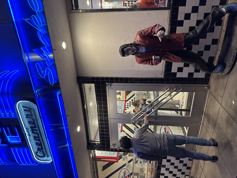 A man in a gray jacket and jeans is opening the door to a creamery. The creamery has a blue neon sign and a mannequin of Elvis Presley standing near the entrance. The exterior of the building is decorated with black and white checkerboard tiles. A sign on the door reads "1024 Orange". The creamery's interior is visible through the glass door.
