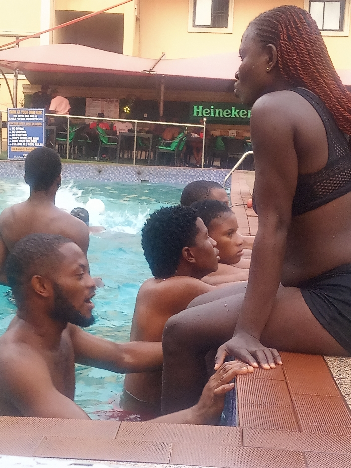 A group of people is enjoying time at a swimming pool. Some are in the water, including a man with a beard who appears to be talking or laughing. A woman with braided hair is sitting on the pool's edge. Behind them, there's a bar area with a "Heineken" sign and people seated at tables. The pool area is outdoors, possibly at a resort or hotel, with a building in the background. A sign with swimming pool rules is visible.