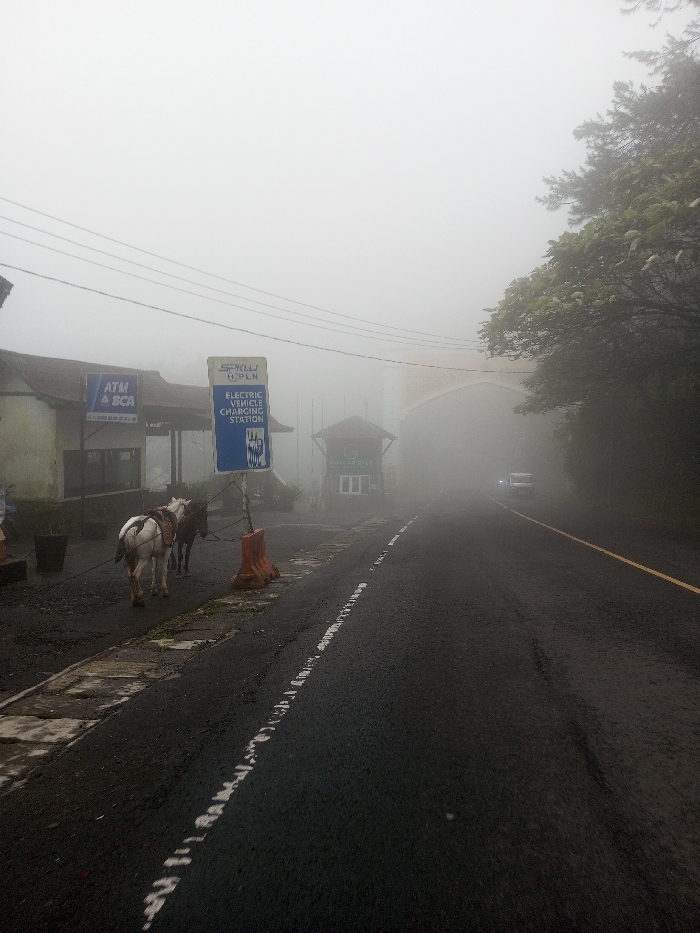 The scene, reportedly located in the city of Siruppiddy, Sri Lanka, depicts a foggy roadside environment. A two-lane asphalt road occupies the center and right foreground, featuring a solid white line at its left edge that transitions into a dashed white line further along, and a solid yellow line visible on the right side of the road in the mid-ground. Visibility is significantly reduced by dense fog, which obscures the background and diffuses light. On the left side of the road, a paved shoulder or dirt area hosts two horses standing passively, facing away from the camera. The horse closer to the viewer is predominantly white with brown markings on its back, possibly fitted with a saddle or harness, while the second horse behind it is dark brown or black. An orange plastic traffic barrier rests on the ground near the horses. Behind the horses, a blue sign with white text is visible, reading "SPKLU PLN" at the top, followed by "ELECTRIC VEHICLE CHARGING STATION" and a graphical logo. Further left and behind this sign, a building with a dark roof and light-colored walls is partially visible, and an "ATM BCA" sign is faintly discernible above another structure. Continuing down the left side, a small booth or building with a dark roof and a sign bearing the Indonesian text "PUNGUT RETRIBUSI" (Collect Fee) is present. Overhead utility lines are strung across the misty sky. The right side of the road features dense green trees and vegetation, partially obscured by the fog. In the distance, along the road, a faint white vehicle, possibly a van, is visible through the fog. A large, light-colored archway or structural gateway spans the road further into the heavily fog-shrouded distance. No human figures are clearly visible or engaged in direct action.