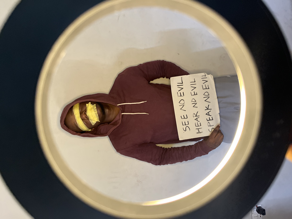 The image depicts a dark-skinned individual, identified as being in Ngleshi Amanfro, Ghana, standing against a plain white wall. The person is centrally framed by a lit circular ring light, with its outer edge appearing dark. They are wearing a maroon hooded sweatshirt with white drawstrings and light grey pants. Two horizontal strips of yellow tape cover the individual's eyes, and two more strips of yellow tape cover their mouth. The individual's left hand holds a rectangular white sign at waist level. The sign bears three lines of handwritten black text: "SEE NO EVIL", "HEAR NO EVIL", and "SPEAK NO EVIL". The person looks directly towards the viewer.