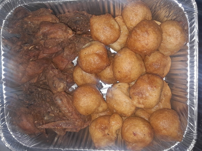 The image presents an overhead view of a rectangular, corrugated aluminum foil tray, situated in Hotoro South, Nigeria. The tray is bifurcated into two distinct food components. The upper half contains a mass of dark brown, irregularly portioned fried poultry, exhibiting visible bone fragments and a coarse, crispy exterior, consistent with fried chicken. The lower half contains approximately twenty to twenty-five uniformly spherical to ovoid food items, light to medium brown in color, possessing a slightly textured and oily surface, consistent with fried dough balls. No human subjects or direct interactions are depicted. The immediate background is indistinct due to shadow.