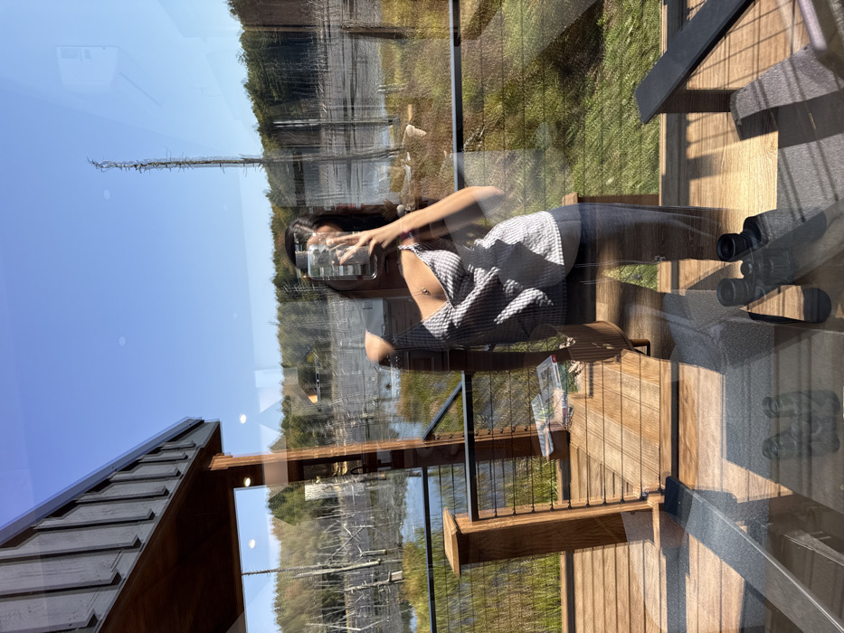 A female subject is depicted in reflection, taking a smartphone selfie through a large window while standing on a wooden deck in Otego, United States. The subject wears a light-patterned camisole and dark trousers, with her face partially obscured by the phone. The wooden deck features horizontal planking, a wooden post, and a cable railing. A small wooden table holding several magazines rests on the deck to the left. The foreground reflection on the glass shows a pair of dark binoculars and portions of two dark chairs. The background, visible through the glass, comprises a clear blue sky above a wetland containing numerous standing bare trees in water. Green vegetation borders the wetland, leading to a dense forest line in the distance. A structure with a light-colored roof is faintly discernible within the distant tree line. Part of the building's wooden eaves is visible in the upper left of the frame, indicating bright, clear daylight conditions.